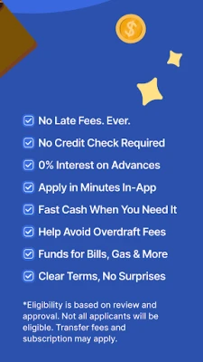 Instant Cash Advances have no min or max repayment periods. Advances have 0% max interest rate with no late fees, origination fees, or impact to credit score.