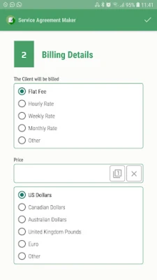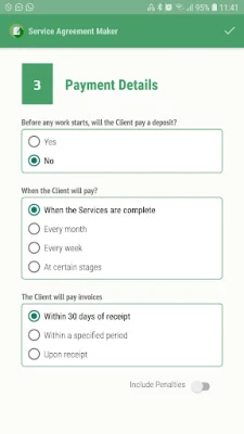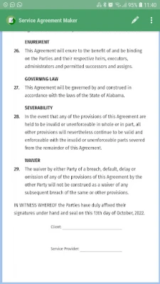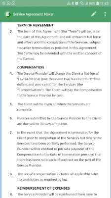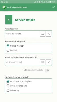 The Service Agreement App uses the automated contract form (agreement template) for drawing the General Service Agreement and other Service Agreement forms. This contract app allows to create agreement form when a service provider (contractor) and a customer exchange services for compensation. The service agreement app changes the agreement text automatically with help of the agreement template in which the needed options are chosen by user. The agreement template saves all entered data between work sessions.
